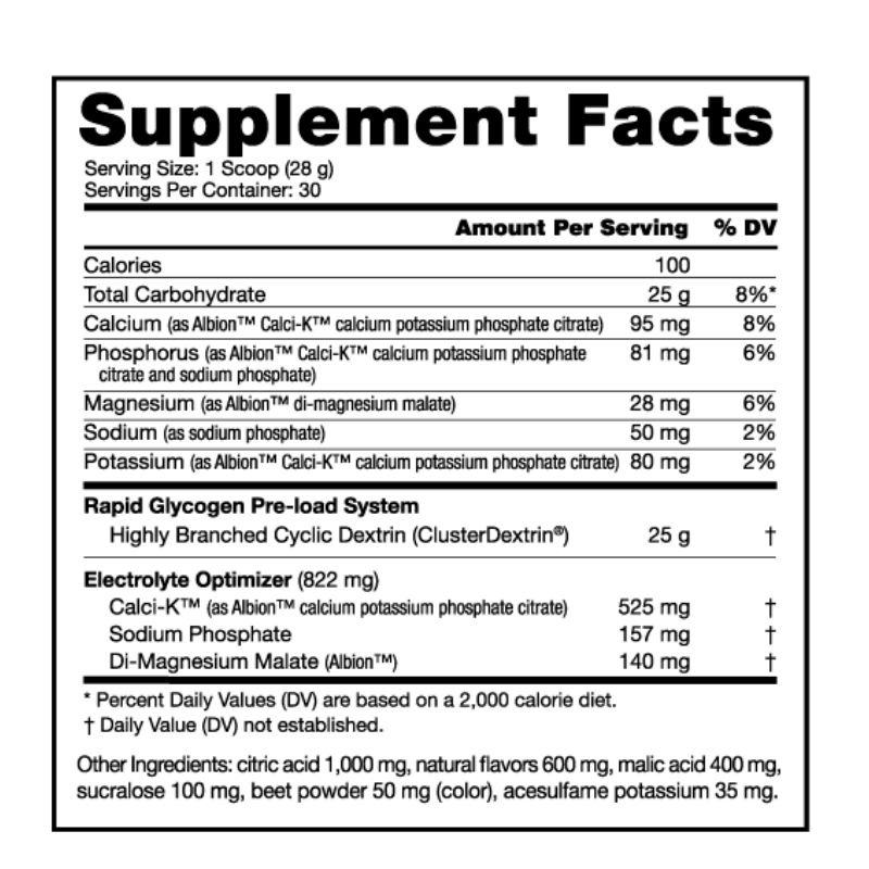 Rapid Glycogen Preload System (Highly Branched Cyclic Dextrin), Electrolyte Optimizer (Calcium Potassium Phosphate Citrate), Sodium Phosphate, Di-Magnesium Malate)